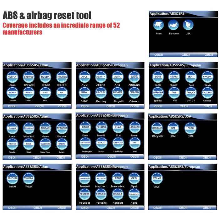 Chrysler, Ford (US), GM, Acura, Daewoo, Honda, Hyundai, Infiniti, Isuzu, Kia, Lexus, Mazda, Mitsubishi, Nissan, Perodua, Proton, Scion, Subaru, Audi, Bentley, BMW, Bugatti, Ford (EU), Jaguar, Land Rover, Maybach, Mercedes Benz, Mini, Opel, Porsche, Saab, Seat, Skoda, Smart, Sprinter, Vauxhall, Volvo, VW, Abarth, Alfa-Romeo, Citroen, Dacia, Fiat, Lancia, Maserati, Peugeot, med fler.