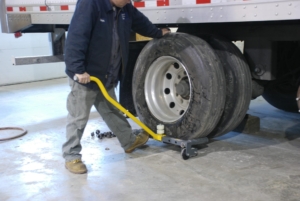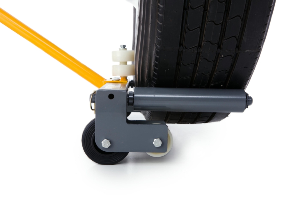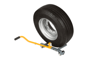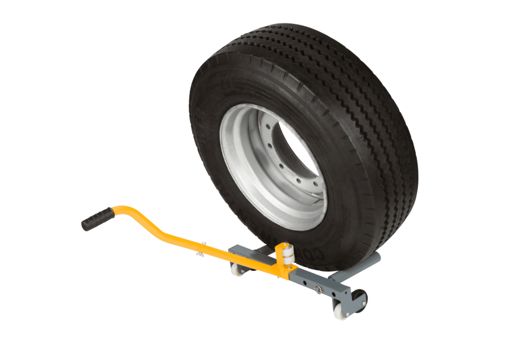 Denna hjuldolly är monterad med nylonhjul samt rullhjul på däcksidan och underlättar montering av tunga hjul på fordon.